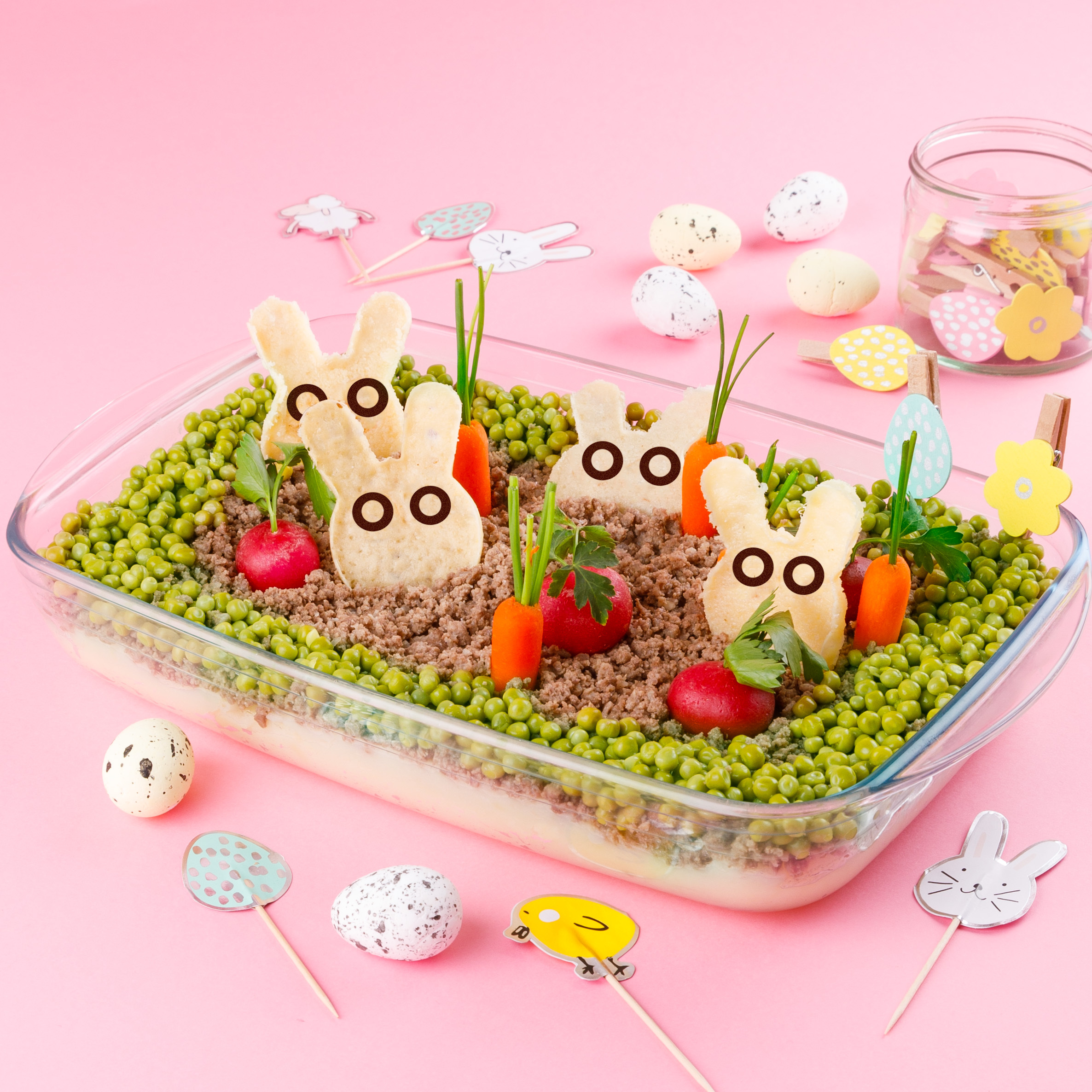 Je découvre la recetteEn avant, marche ! Rangés deux par deux, les lapins, eux aussi, sont prêts pour la chasse aux œufs !